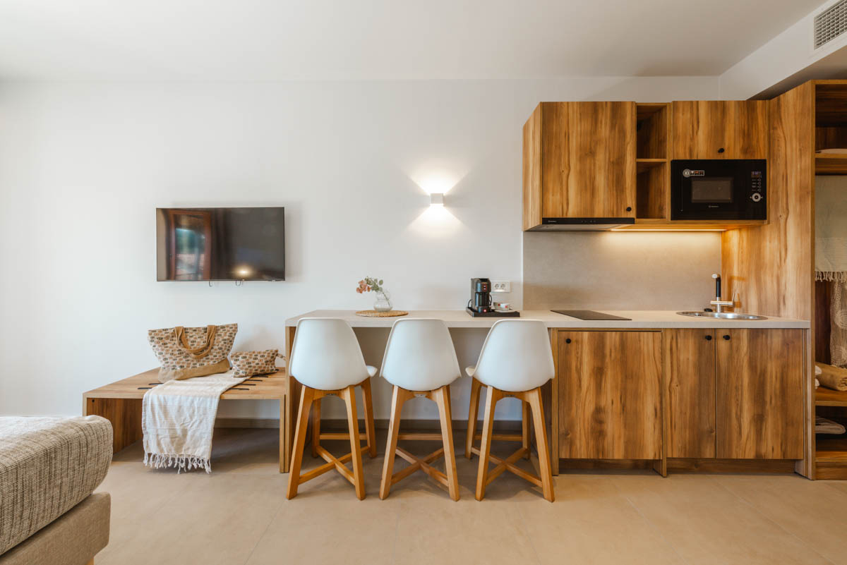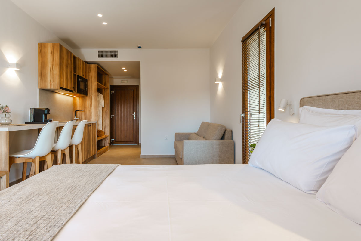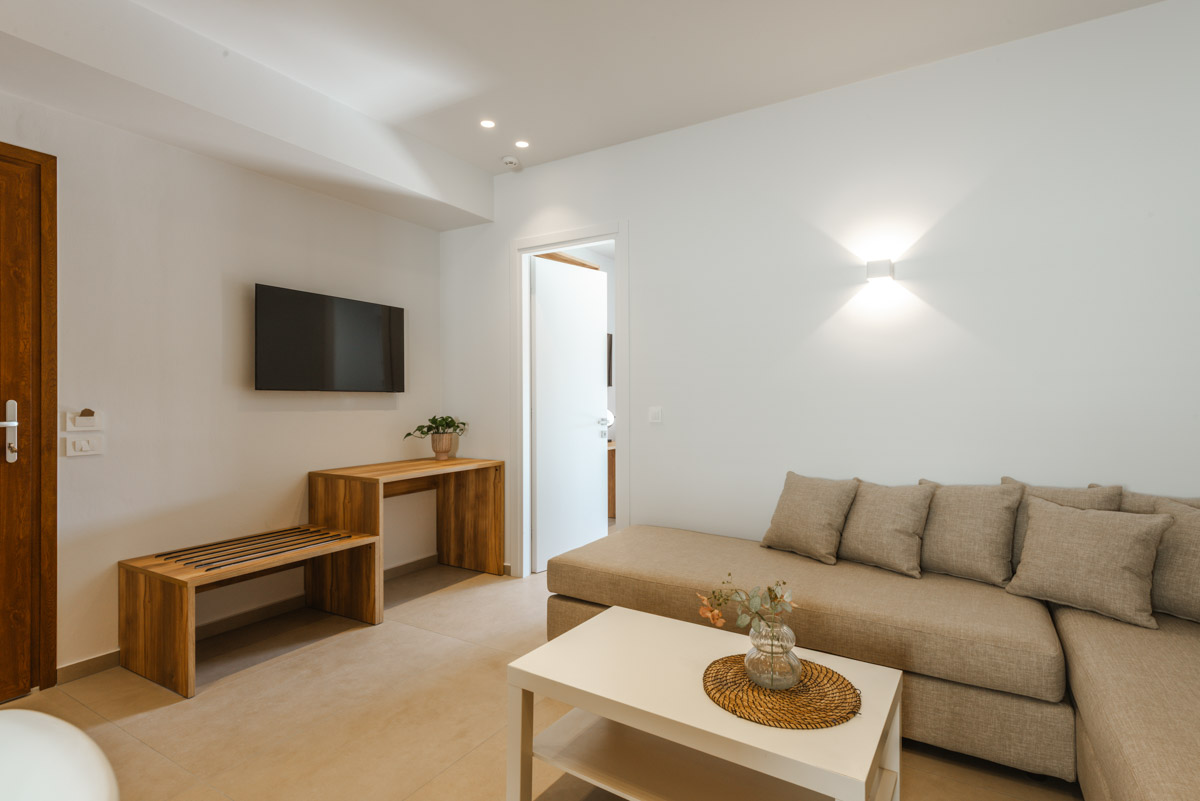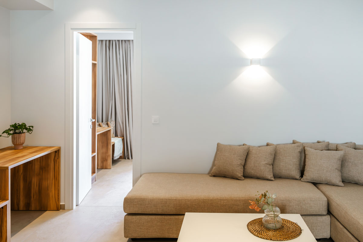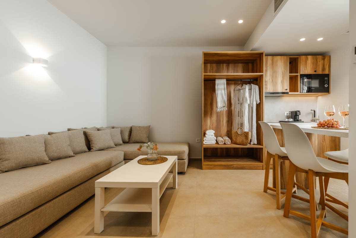 Ζήστε την εμπειρία της διακριτικής πολυτέλειας στα Superior Apartments. Με εμβαδόν 50 τ.μ., αυτά τα διαμερίσματα είναι σχεδιασμένα για όσους αναζητούν την άνεση ενός πραγματικού σπιτιού. Η διαρρύθμιση προσφέρει ιδιωτικότητα, διαχωρίζοντας το κυρίως υπνοδωμάτιο με το διπλό κρεβάτι από το ευρύχωρο σαλόνι με τον γωνιακό καναπέ-κρεβάτι. Με πλήρως εξοπλισμένη κουζίνα και μοντέρνο μπάνιο με walk-in shower, κάθε λεπτομέρεια είναι προσεγμένη. Διαθέσιμα σε ισόγειο, 1ο και 2ο όροφο, τα διαμερίσματα διαθέτουν ιδιωτικό μπαλκόνι ή βεράντα για να απολαύσετε τον εξωτερικό χώρο.